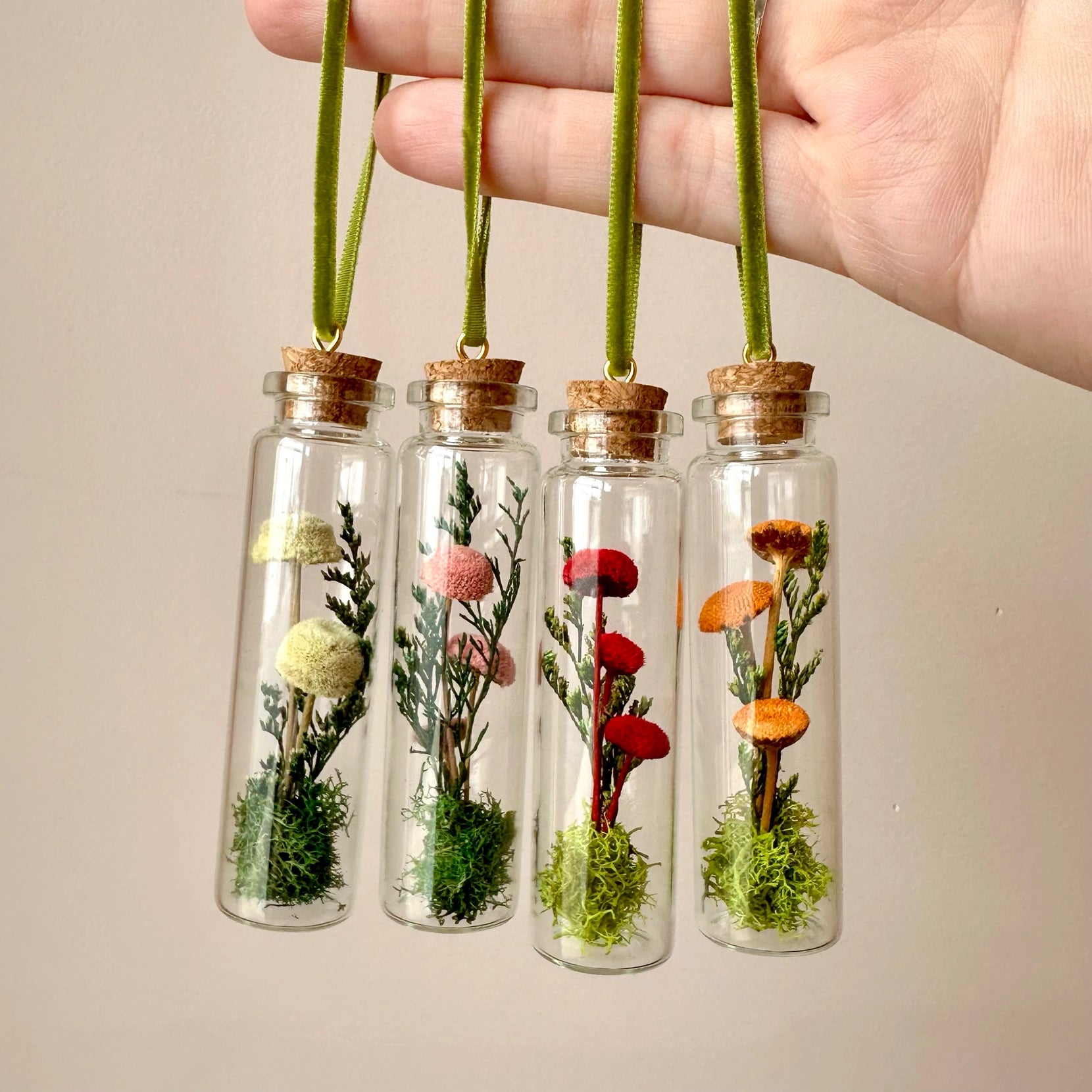 Glass terrarium Christmas ornaments made with real dried florals and mosses! These ornaments make great holiday gifts for gardeners, mushroom lovers & your friend who loves cottagecore!