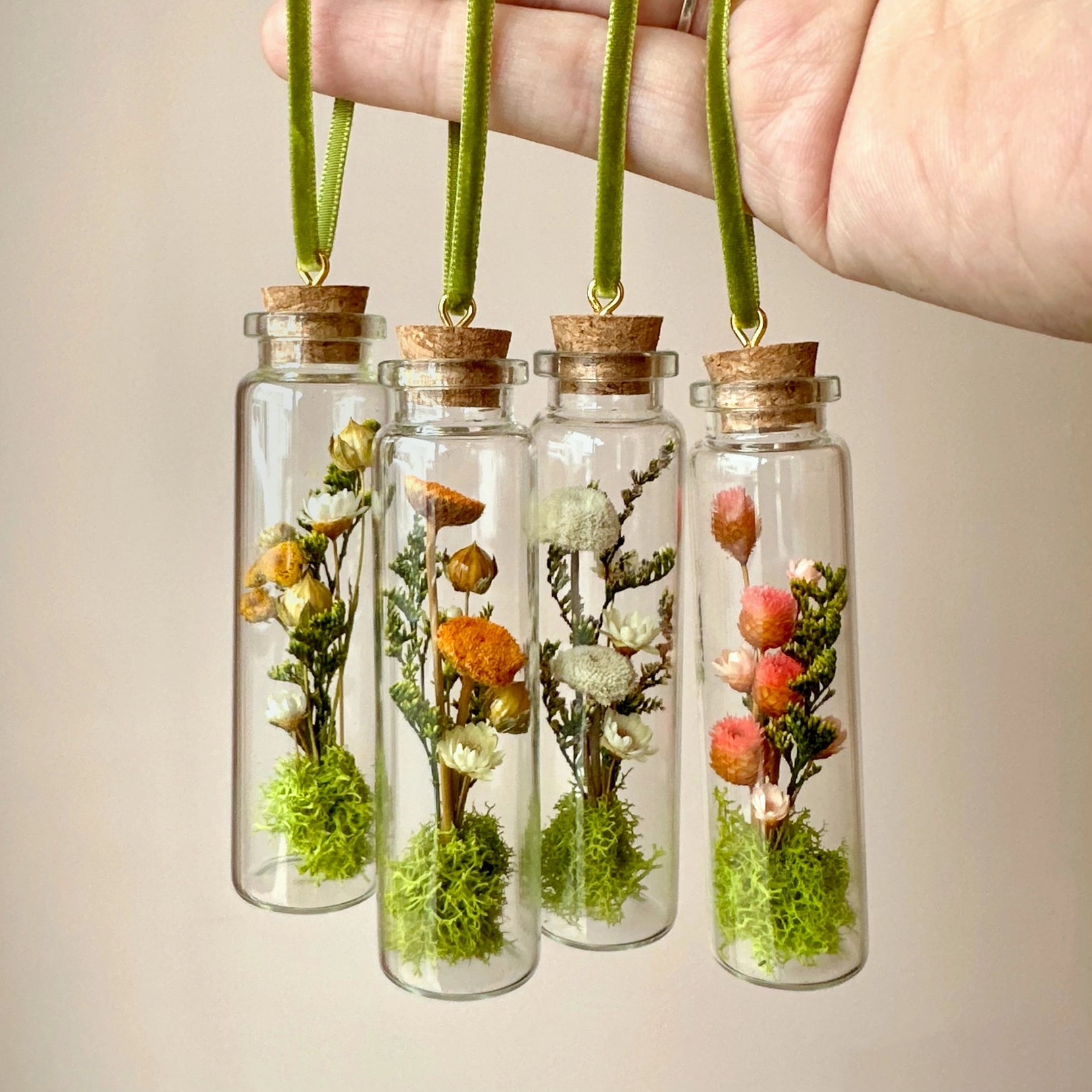 Glass terrarium Christmas ornaments made with real dried florals and mosses! These ornaments make great holiday gifts for gardeners, mushroom lovers & your friend who loves cottagecore!