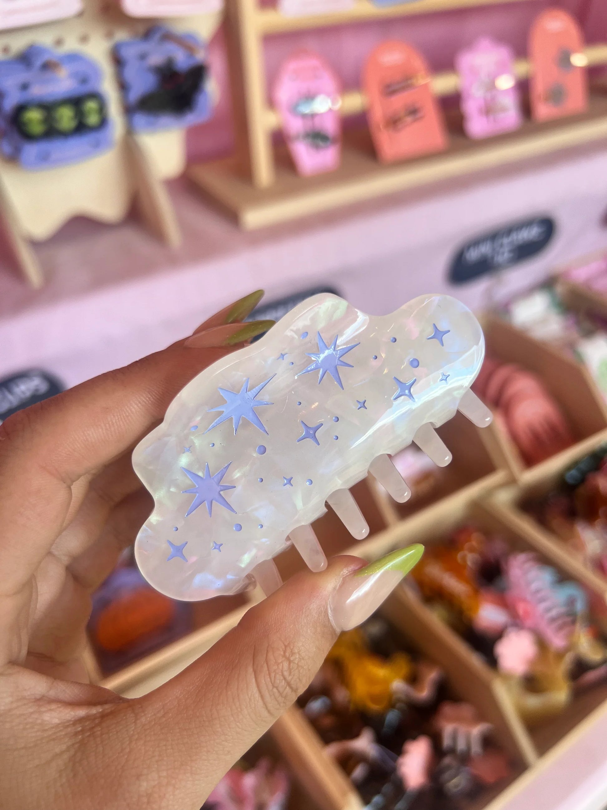 This shimmery acrylic hair claw with periwinkle stars