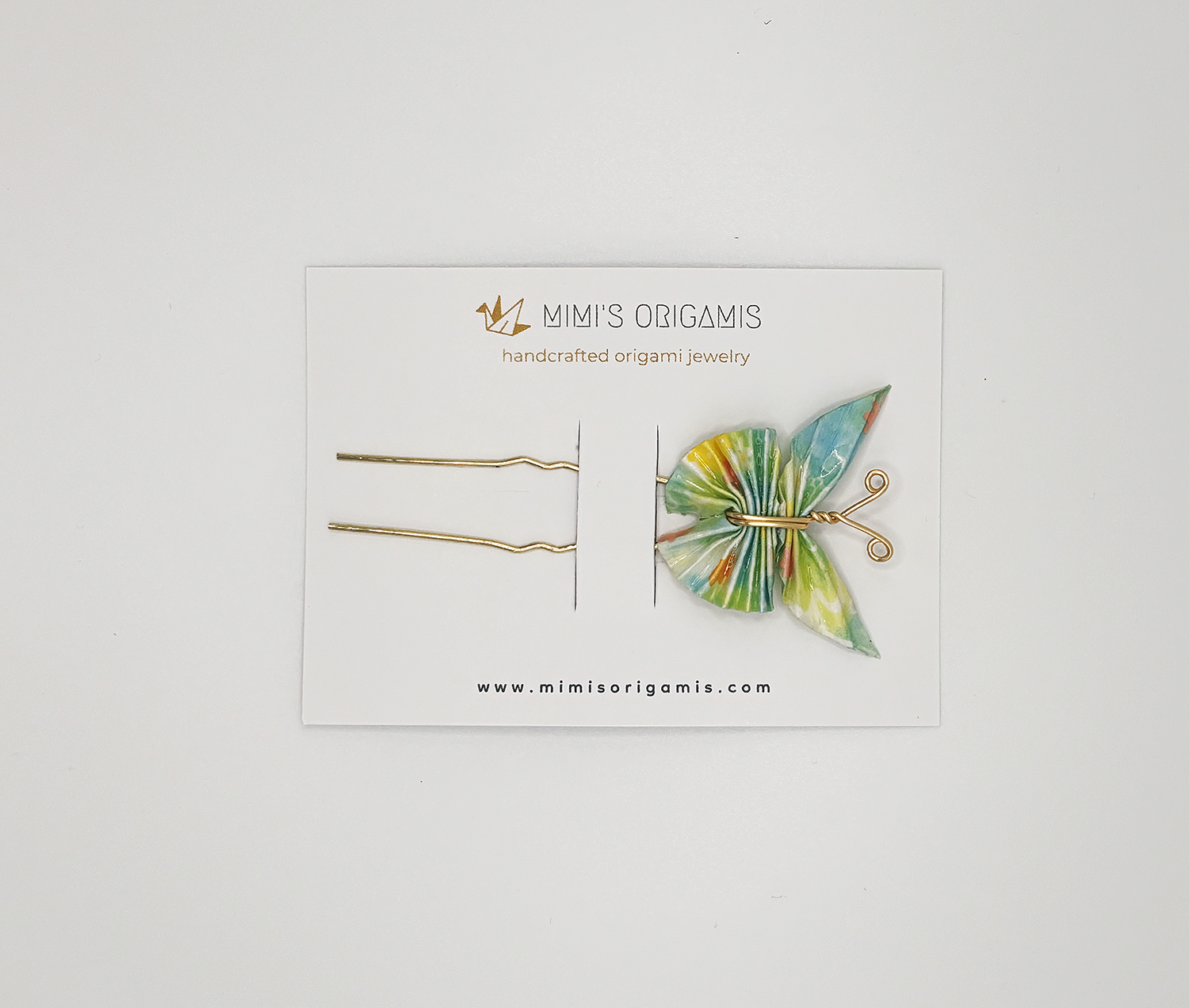 - Materials: Washi paper, sealer, gold-plated tarnish-resistant wire, 2.5 inch gold-plated hair pins