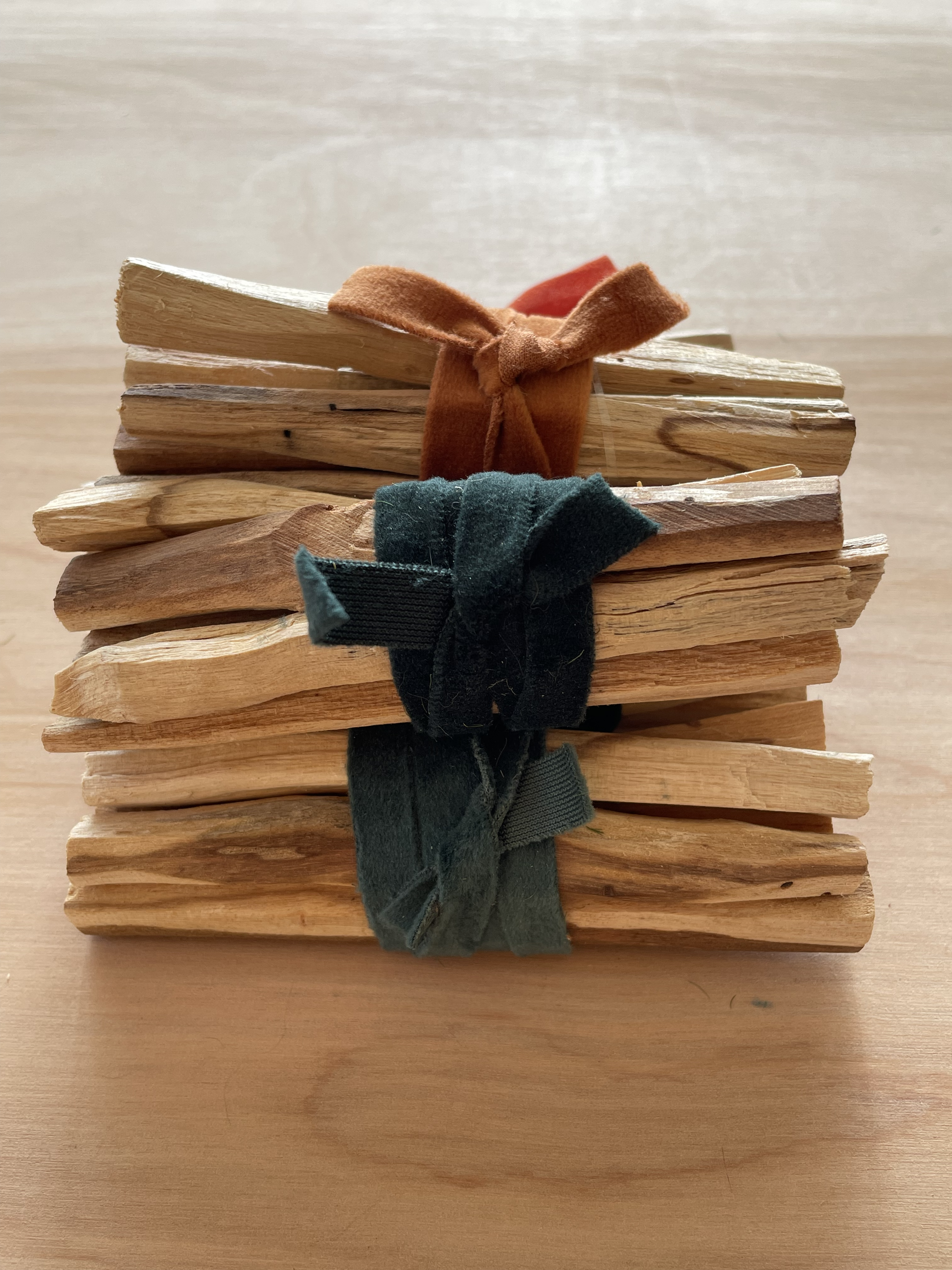 - 4 pieces of Peruvian Palo Santo hand-wrapped with a bright ribbon.