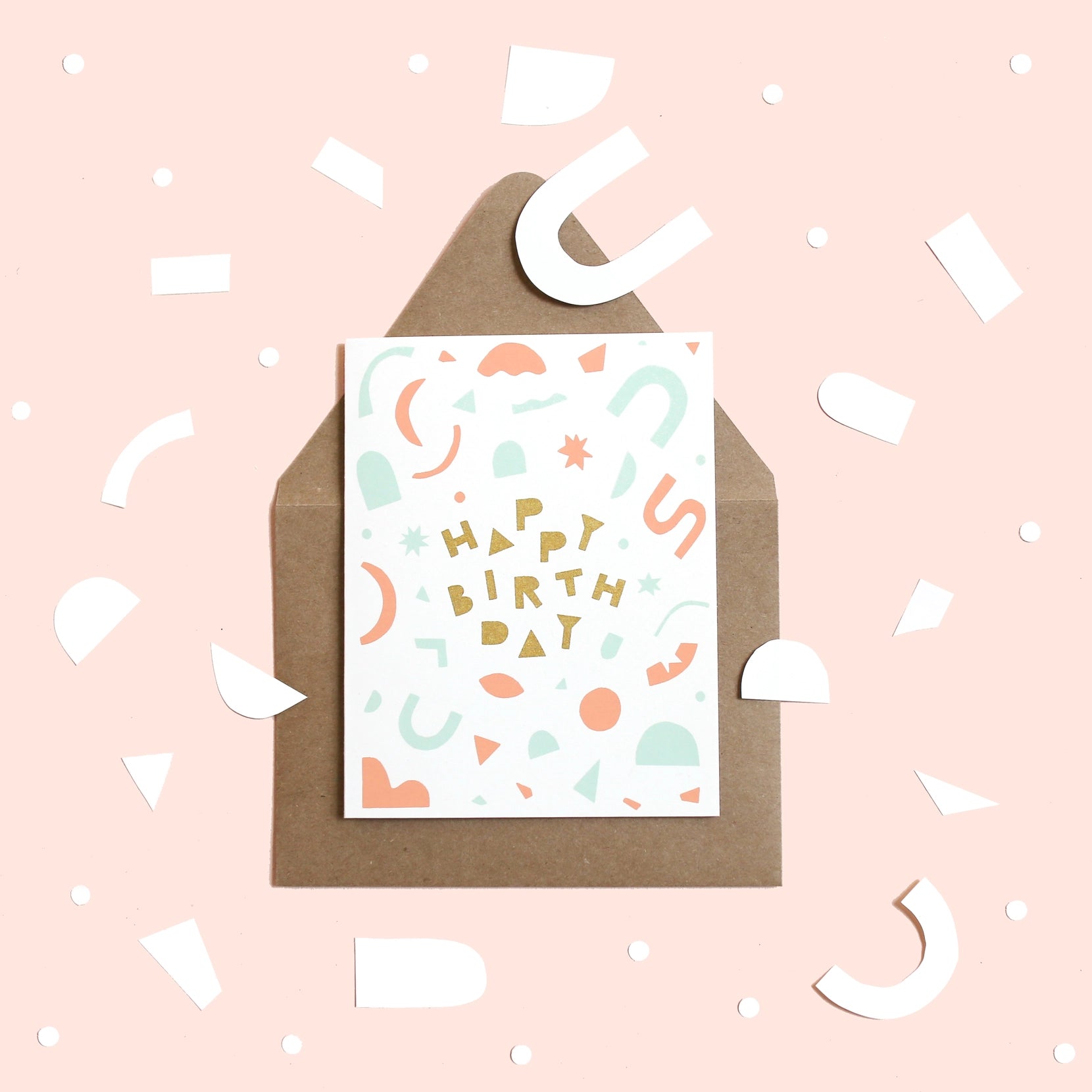 A festive and colorful birthday card that feels exciting to celebrate with. This birthday card is perfect for kids or friends of any age, full of festive geometric shapes, metallic ink and happy colors.